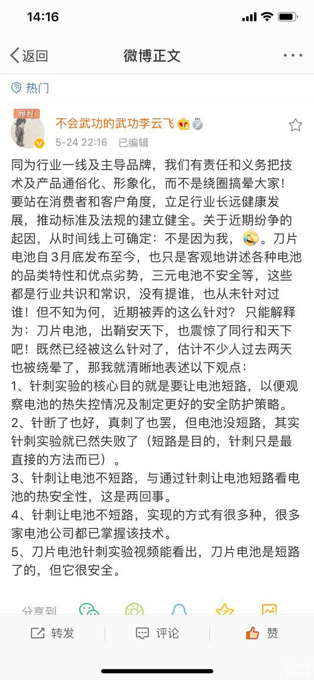 值得一提的是,尽管“看热闹不嫌事儿大”的网友纷纷鼓励比亚迪“怼回去”,但李云飞还是发表了一篇微博长文强调,“三元电池不安全等,这些都是行业共识和常识,没有提谁,也从未针对过谁!但不知为何,近期被弄的这么针对?”