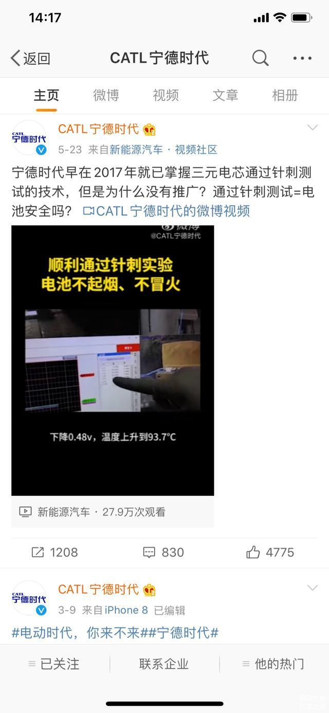 眼见测试“翻车”了,评论区里网友们顿时吵做一团,第二天(23日)深夜,宁德时代官微又补上了一条523和811电池进行针刺测试的视频,并再度发文质疑:“早在2017年就已掌握三元电芯通过针刺测试的技术,但是为什么没有推广?通过针刺测试=电池安全吗?”