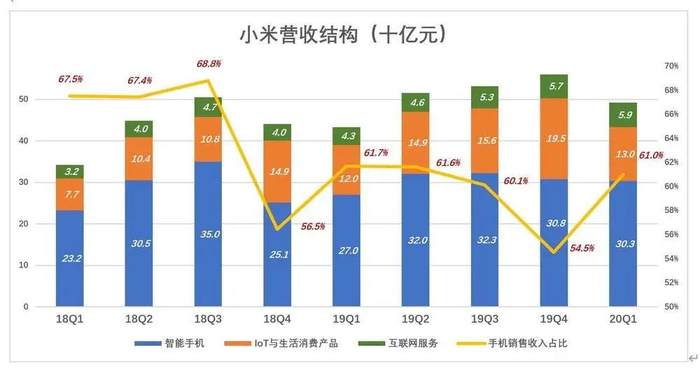 2018年上市后,小米营收结构发生了很大变化:2018年Q4手机251亿、IoT与生活消费产品149亿、互联网服务40亿,手机销售收入占比56.5%,首次降至60%以下。2019年Q1回升至61.7%。