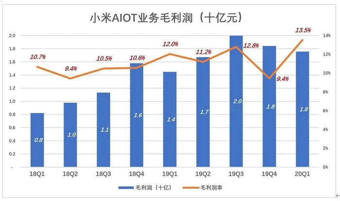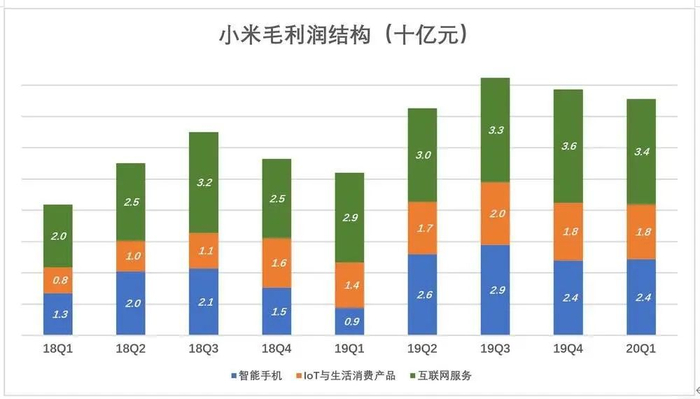 2020年Q1,互联网、手机、IoT与生活消费品毛利润分别为34亿、24亿和18亿。