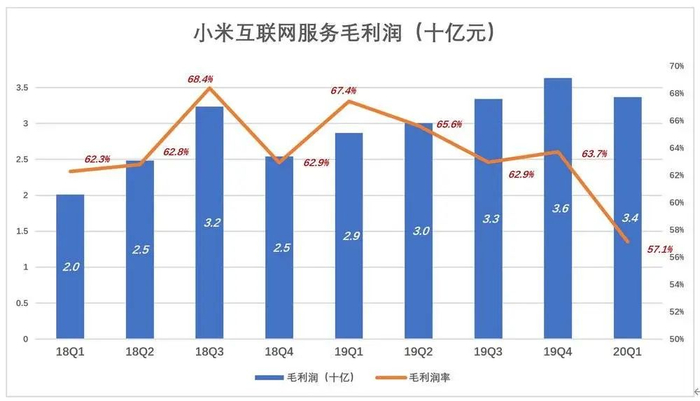 小米互联网服务毛利润率远高于硬件业务,2020年Q1突然跌到57.1%,较2019年同期低10个百分点。假如Q2、Q3能够回到60%以上,说明Q1毛利润率低的主要原因是疫情。