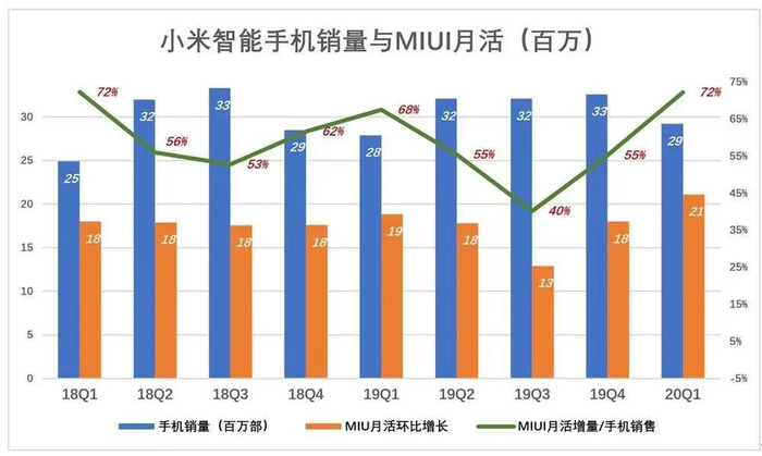 观察发现小米智能手机出货量总是高于MIUI用户增量。例如2020年Q1,小米智能机出货2920万,MIUI用户达3.3亿,环比增加2110万,占本季出货量的72%。说明28%的购机者原本就是小米智能机用户。
