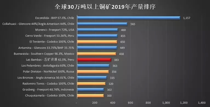 2019年,Las Bambas铜矿产铜38.3万吨,产能排名全球第8,也是唯一一座入选全球前十的中资铜矿。