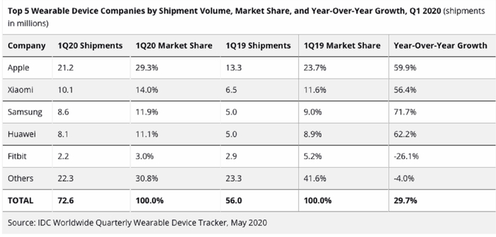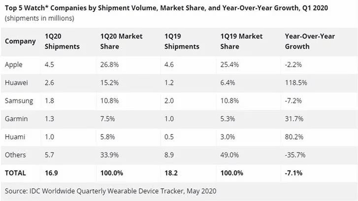 IDC也于近日发布了一份2020年第一季度全球智能可穿戴设备的市场分析报告。
