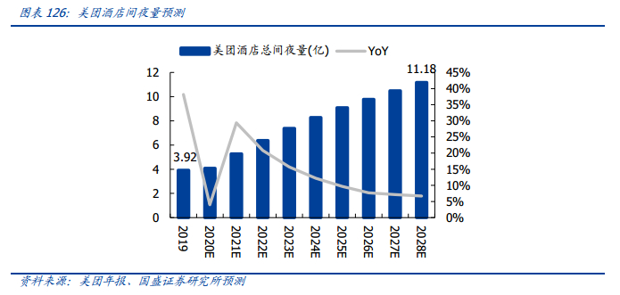 美团酒店的间夜量在未来仍将保持高增速,2019 年美团酒店间夜量增长 1.08 亿,到 2028 年达到 11.2 亿的规模。
