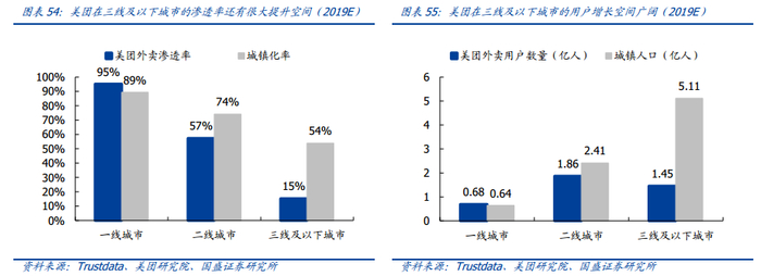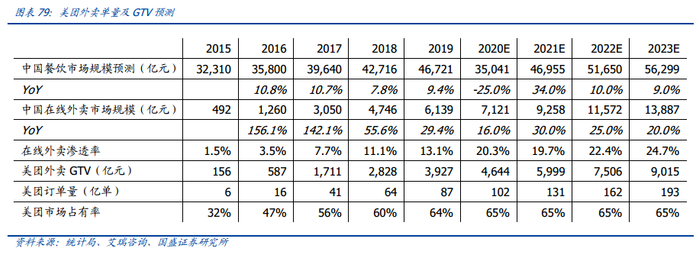 外卖单量增长维持高增速,市场规模离天花板尚远。中国餐饮及外卖行业未来十年仍将处于快速发展的黄金时期,而当下美团外卖的渗透率及人均单量仍处于较低水平,仍有很大的发展空间。