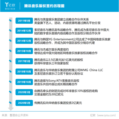 2014年,腾讯与索尼音乐展开合作,在2018年上市前,腾讯音乐娱乐集团还接受了索尼音乐和华纳音乐现金代价约2亿美元的入股。