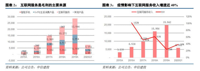 (二)游戏板块提升有可持续发展趋势。游戏业务收入2020Q1同比增长80%,整个手游行业增长约40%。小米作为分发渠道不自研游戏,因此以前主要是跟着行业趋势走,但是现在第一季度结果出来比行业要高很多,主要原因是(1)小米中高端机型比例提升,米10高端机型ARPU比低端千元机高近2-3倍,长期来看中高端机型提升对单一用户ARPU会有明显的贡献。(2)受疫情影响用户居家会通过游戏消磨时间为游戏充值。
