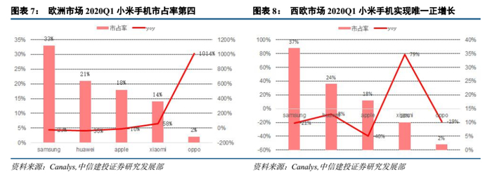 境外市场收入占比达到50%,欧洲市场手机出货量同比增长58.3%。1Q2020,小米在欧洲市场市占率达到14.3%,排名前四。其中在西欧市场出货量同比增长79.3%。小米在欧洲市场的快速增长一方面是推出了合适的产品,一季度全球最畅销的10款手机中,小米有3款。另一方面是小米不断完善欧洲的销售渠道,扩大销售范围。我们认为随着欧洲疫情的缓解,小米在欧洲的出货量也将逐渐恢复,截至5月第三周,欧洲市场的每周激活量恢复到2020年1月份平均周激活量的90%以上。小米在欧洲多个国家出货量排名进入前五,比如西班牙市场占有率达到第一,在法国和意大利排名第三,去年第一次正式进入的德国市场达到第四的成绩。我们认为目前小米在西欧的市场份额还有继续提升的空间。相比排名前三的三星(33%)、华为(21%)、苹果(18%),小米市占率还有提升空间。从出货渠道看,小米现在的销售渠道主要是公开市场,今年开始将连续进入运营商渠道。运营商渠道的出货占比在欧洲较高,进入运营商渠道,将进一步提高小米的市占率。我们认为小米在欧洲会主打中高端市场。虽然欧洲市场5G建设还没大规模实现,但是未来5G必然会是主流方向。所以目前小米在欧洲也是主推5G手机,比如小米10系列。同时由于欧洲地区有许多西班牙语和葡萄牙语地区,这都为未来开辟拉美和非洲地区奠定了基础。