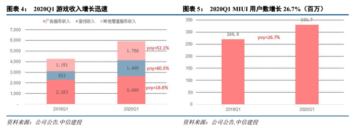 首先手机是互联网变现最主要的部分。不论是国内还是海外小米都采用通过手机销售扩大用户基数,到向用户提供服务,再到从服务实现大规模变现这三个过程。在用户方面,2020年第一季度,小米互联网服务的用户活跃度和使用时长都有明显增加,2020年3月,全球MIUI月活跃用户数达到3.31亿人,同比增长26.7%,其中中国大陆地区的MIUI月活跃用户数达到1.12亿人。在国内手机渗透率已经比较高的情况下互联网服务业务增速达到38.6%,增速较高的主要原因有: