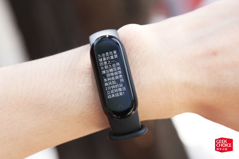 更大的屏幕当然能显示更多的内容,屏幕显示的汉字从小米手环 3 时的 24 个汉字增长到小米手环 4 上的 45 个,目测小米手环 5 比上代多显示两行,已经到了 55 个。