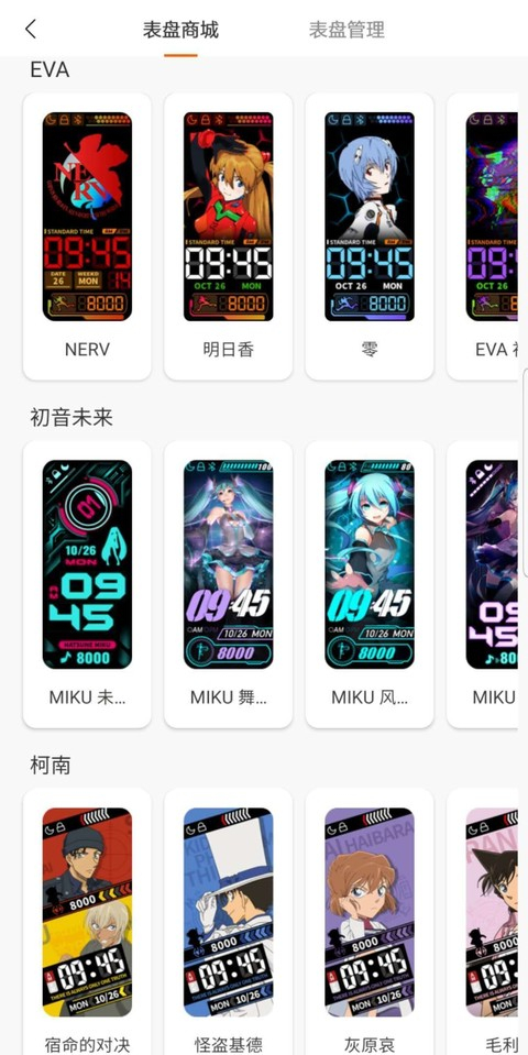 还有一个我在刚开始没有发现的大升级,小米手环 5 竟然支持动态显示。新世纪福音战士、初音未来、柯南、海绵宝宝等 54 款 IP 表盘都可以动起来了。