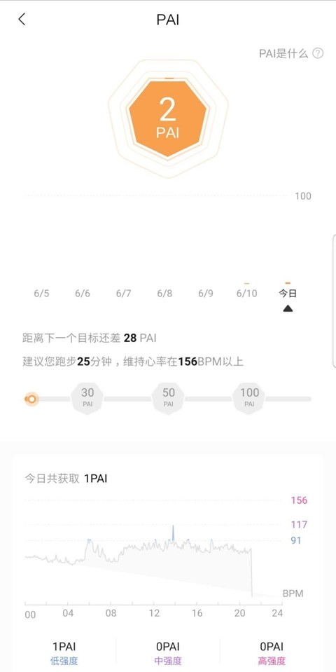 在智能手表上的 PAI 值,小米手环这次也终于引进了。PAI 算法能将心率数值转化为 PAI 值,让用户更直观地了解身体状态。官方称持续将 PAI 分数保持在 100 以上的人群,患病风险更低。看了一下我今天 PAI 值只有 2,默默立一个明天骑车上班的 FLAG(我猜没人能看到)。