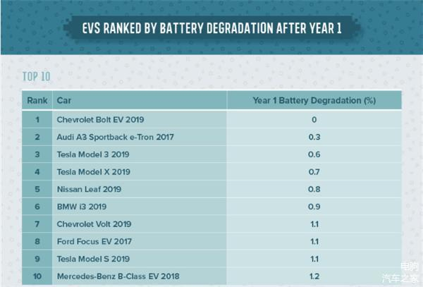榜单显示,车辆使用一年后,电池衰减最小的前三名车型分别是,2019款雪佛兰Bolt无衰减,2017款奥迪A3 e-tron衰减0.3%,2019款特斯拉Model 3衰减0.6%。