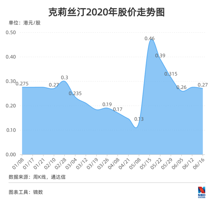 今年2月26日,克莉丝汀股价在最后一分钟被拉起,最终当日上涨150%。5月11日午后,股价又被一路拉升,从开盘的0.130港元,最高上涨到0.780港元,最终收盘上涨361.54%。后一个交易日中更一度被拉高到1.30港元。但好景不长,此后公司股价又节节败落。