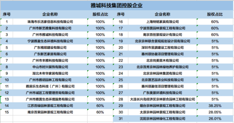 目前雅城科技旗下共有31家控股企业,分布在广州、中山、宁波、南京、上海、北京等城市,主要涉及装饰家居、生态科技、园林景观、建筑工程等领域。