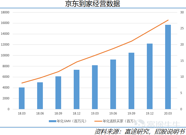 京东到家则是国内最大的本地即时零售平台之一,依托达达快送和零售店家合作伙伴,为消费者提供超市便利、生鲜果蔬、医药健康等1小时配送到家服务。业务覆盖全国700个县市区,截止到2020年3月已经拥有2760万名活跃用户,年化GMV达到157.24亿元。