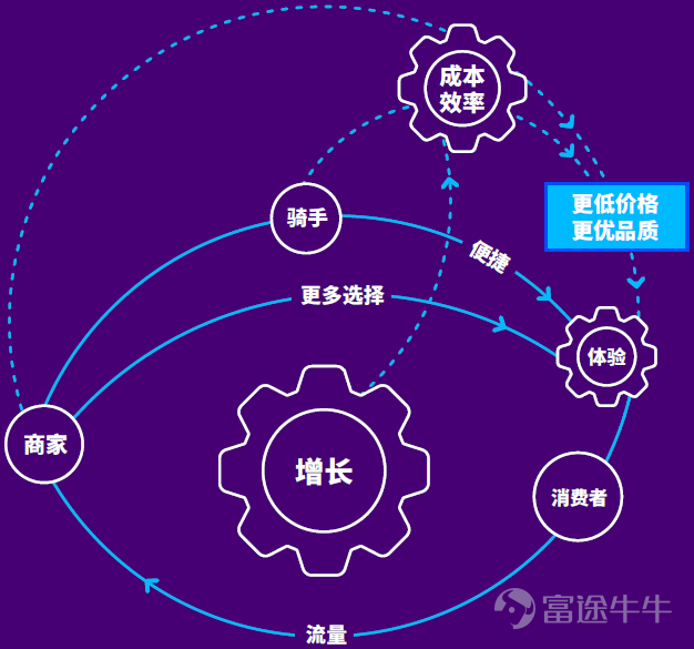 可以说,美团点评是国内运用亚马逊「飞轮效应」最好的公司:商户在平台聚集,增加了消费者的选择,便捷的配送服务进一步优化用户的体验;购物体验提升的消费者带来更多的流量,吸引更多的商家,于是又有更多的用户、更多的购物频次。对于商家,销售增长,利润增加,可以运用更多资源改进产品、降低价格,提供更多更好的优质产品,进一步优化平台消费者的体验。