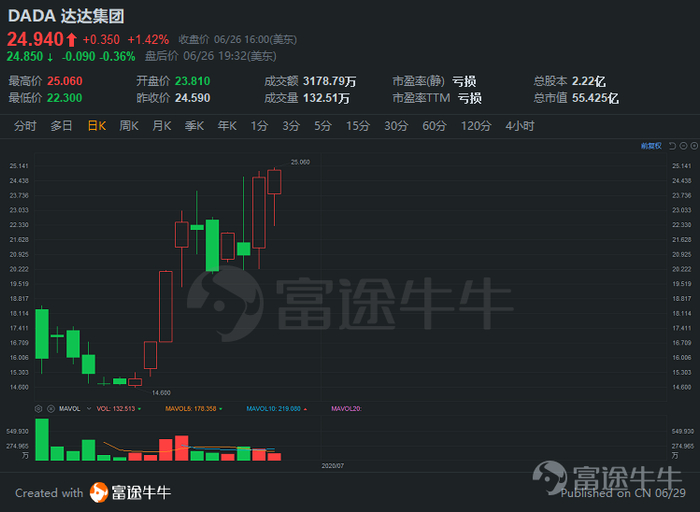 拥有京东和沃尔玛背书的达达集团在美股上市之后表现出色,截止6月26日,涨幅约36%。