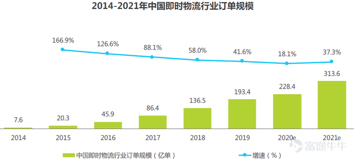 典型用户为一二线大城市白领,同城分钟级、点对点的送达服务满足了消费者对效率和便捷的需求。2019年国内即时配送市场规模就超过193.4亿单,随着餐饮外卖服务增势不减,生鲜、商超、美妆、医药等新零售品类扩张,覆盖场景拓宽至生活方方面面,行业发展加上新的引擎,未来增长空间广阔。