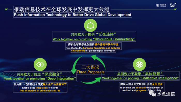 杨杰董事长说:孤举者难起,众行者易趋。为了推动信息技术在全球发展中发挥更大效能,中国移动提出以下 3 点倡议。