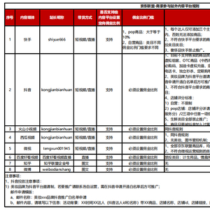 亿邦动力获悉,最新的京东联盟-商家参与站外内容平台规则已涵盖快手、抖音等8家内容媒体,带货方式、佣金比例门槛、商品要求及参与方式详见下图。
