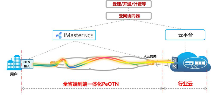 光云一体:通过云网协同器,对网络SDN管控平台与云资源平台进行自动化协同,首个实现PeOTN网络和云资源的一键式同开同停,业务发放时间从天级缩短到分钟级,同时通过用户APP可提供用户自助调速、时延和流量可视等差异化服务。