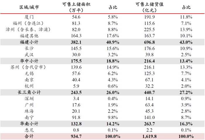 表 2:公司土地储备集中于海西、长三角、华南及中部核心城市