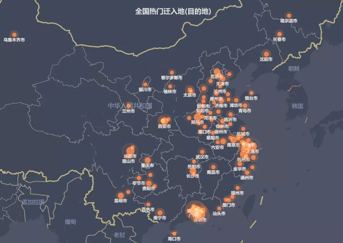 数据来源:百度地图,中达证券研究;注:数据日期为2020年3月24日,圆圈越大代表人口迁入强度越大