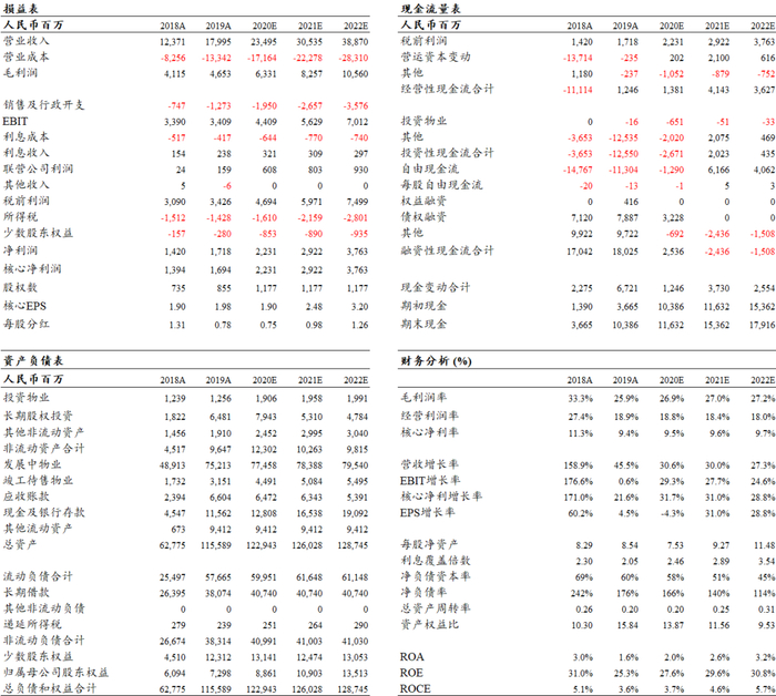 营收业绩稳步增长,财务状况持续改善。2019年,公司实现营收180.0亿元(+45.5%);归母净利润17.2亿元(+21.0%),整体业绩稳健增长。现金流及融资方面,公司截至2019年末货币资金达115.6亿元(+154.3%);整体有息负债中一年以上到期占比约82%,货币资金对短期债务覆盖倍数也由2018年末的1.20倍提升至2019年末的1.44倍,而融资成本及净负债率分别下降0.3pct和66pct至5.4%和176%,在规模快速增长的同时实现财务状况持续优化。