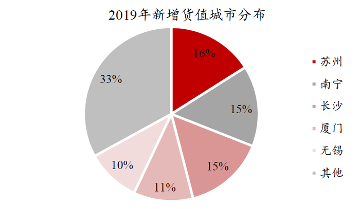 战略深耕核心城市,一二线城市贡献较高。公司多年来坚持围绕主要都市圈的核心城市进行战略布局,在规模增长的同时持续强化城市布局优势,销售金额中高能级城市占比较高。2019年,公司销售金额按城市能级划分约0.9%位于一线城市(深圳、广州),约70.4%位于二线城市(厦门、福州、苏州、无锡等),约28.6%位于三线城市(主要为海西城市群城市),一二线城市销售贡献较高。在公司重点布局的城市中,厦门2019年销售额近百亿元,苏州区域也超90亿元,体现出公司在核心城市深耕上的成效。