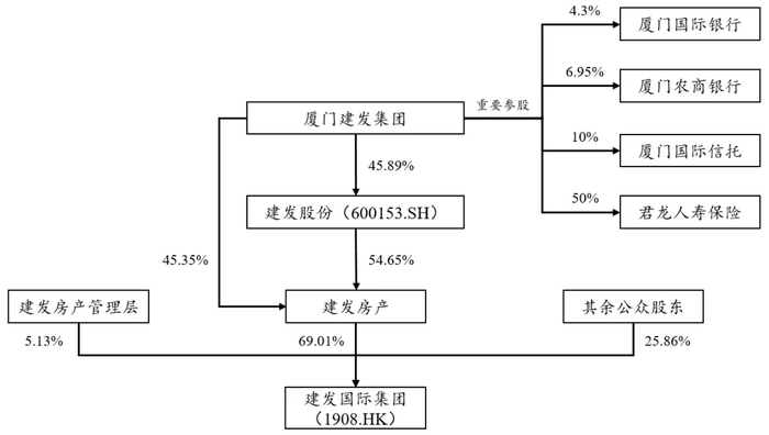 股权结构稳定,股东资源丰富。截至2019年末,建发房产直接持有建发国际集团(1908.HK)69.01%的股份。厦门建发集团持有A股上市公司建发股份(600153.SH)45.89%的股份,而建发股份持有建发房产约54.65%的股份;另外,厦门建发集团直接持有建发房产约45.35%的股份。除建发房产外,建发房产管理层持有建发国际集团约5.13%的股份,其余公众股东持股比例约为25.86%。厦门建发集团作为《财富》世界500强,旗下公司包括旅游集团、会展集团等,重要参股公司包括厦门国际银行、厦门农商行、厦门国际信托等,整体实力强大,能够为公司发展提供强大的资源支持。