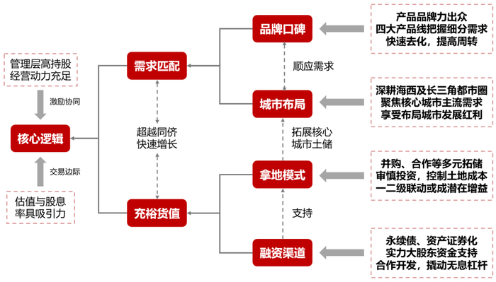 图 1:本文核心逻辑图,公司充足经营动力与特色拿地渠道能够支撑未来超越同侪增长速度