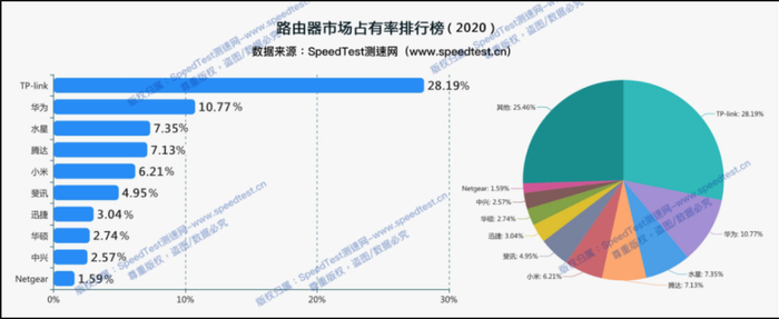 根据测速网数据显示,TP-Link在2019年的市占率为32.88%,而在2020年第一季度这一数字下降为28.19%。