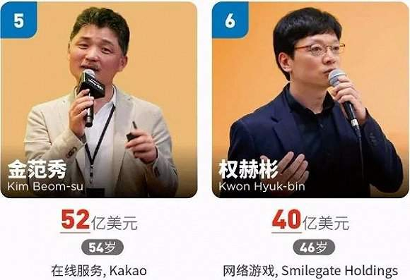 我们注意到,像从事在线服务的KaKao的金范秀,从事网游的Smilegate Holdings的权赫彬、从事网游的NCSOFT的金泽辰、从事互联网业务的Naver的李海珍、从事网游的房俊赫、李俊昊等,都在富豪榜上占有醒目的位置,且财富增长也相对较快。
