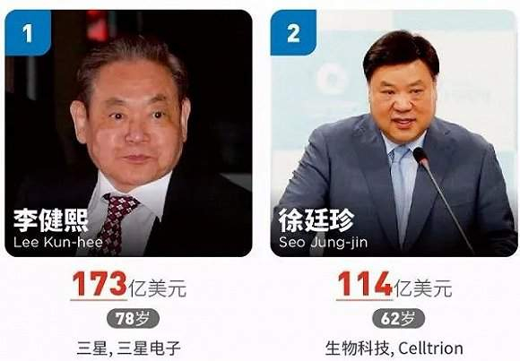 过去,谈及韩国富豪,免不了说起三星、现代、LG、SK等大财阀,尽管他们依旧在榜,但一些财阀如现代、LG、SK等影响力渐渐由盛转为衰微。而像从事生物技术的徐廷珍(Seo Jung-jin)成为今年榜单的最大赢家,一年财富飙涨了40亿美元。此前,有消息说他家的企业开始对新冠肺炎的疗法进行人体试验。总之,新经济、新业态的出现,对韩国财富格局也产生了深刻影响,这是个大趋势。