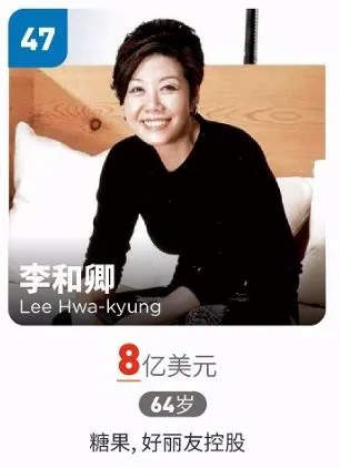 今年这份榜单中,好丽友控股的李和卿(Lee Hwa-kyung)上榜身家为8亿美元。