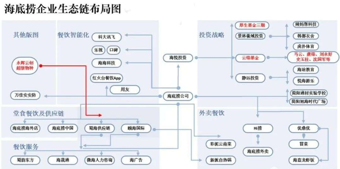 在过去数年间,张勇将围绕着海底捞餐饮经营的相关职能部门,拆分出7大板块(加上海底捞其实是8个)每个板块下面又有无数个小的关联公司: