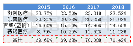 目前,冠脉支架的国产替代率已达70%,冠脉支架的技术壁垒相对更低,行业规模大。目前第三代的冠脉支架的占比高达99%,且竞争格局稳定,市场的集中度也稳步提高。根据下图,我们可以看出,微创一直维持冠脉支架的龙头地位,但与第二、三名的差距不大。