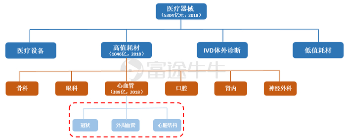 高值耗材:高值耗材又细分骨科、眼科、口腔、心血管、肾内、神经外科,其中心血管领域的高值耗材价值最高(红色线框,也是我们本片文章即将要讨论的重点内容);