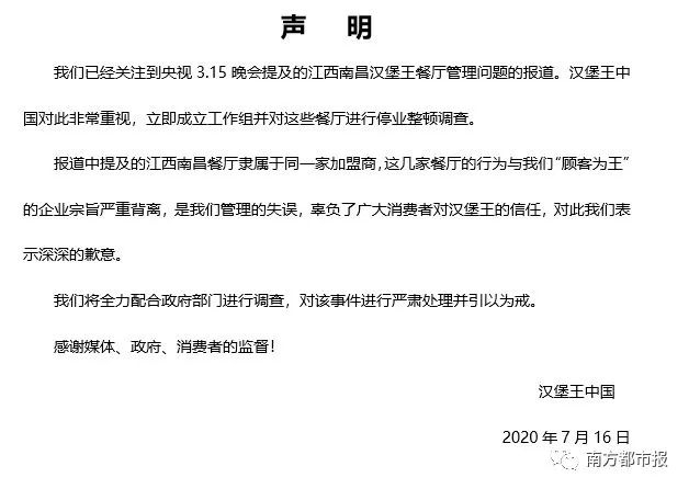 7月16日晚间,汉堡王中国发布声明称已经关注到央视3.15晚会提及的江西南昌汉堡王餐厅管理问题的报道。汉堡王中国对此非常重视,立即成立工作组并对这些餐厅进行停业整顿调查。报道中提及的江西南昌餐厅隶属于同一家加盟商,这几家餐厅的行为与我们“顾客为王”的企业宗旨严重背离,是我们管理的失误,辜负了广大消费者对汉堡王的信任,对此我们表示深深的歉意。我们将全力配合政府部门门进行调查,对该事件进行严肃处理并引以为戒。