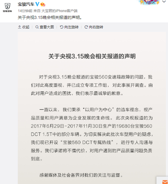 回应还称,此次央视报道的为2017年6月29日-2017年11月30日生产的19680台宝骏560DCT 1.5T中的部分车辆。