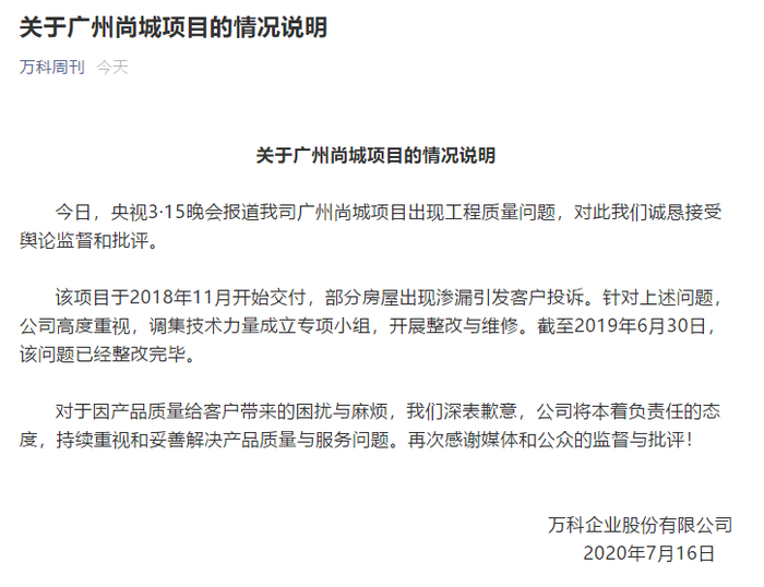 万科深夜回复广州尚城项目:诚恳接受批评 去年已整改完毕