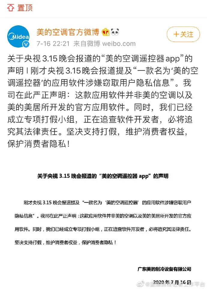 美的空调发布声明称,央视3.15晚会报道提及“一款名为‘美的空调遥控器’的应用软件涉嫌窃取用户隐私信息”,这款应用软件并非美的空调以及美的美居所开发的官方应用软件。同时已经成立专项打假小组,正在追查软件开发者,必将追究其法律责任。