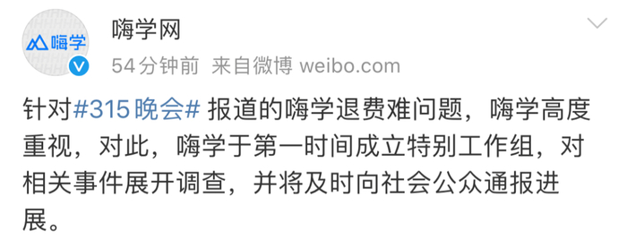 针对315晚会报道的嗨学退费难问题,嗨学高度重视,对此,嗨学于第一时间成立特别工作组,对相关事件展开调查,并将及时向社会公众通报进展。