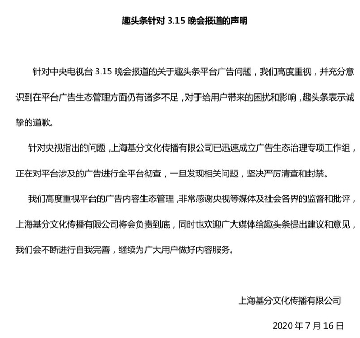 针对央视3·15曝光存在广告乱象问题,趣头条回应称,公司高度重视,并充分意识到在平台广告生态管理方面仍有诸多不足,对于给用户带来的困扰和影响,趣头条表示诚挚的道歉。