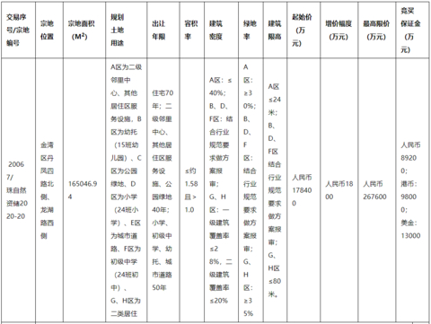 该地块编号为珠自然资储2020-20,位于金湾区丹凤四路北侧、龙湖路西侧,为二类居住用地。宗地面积165046.94㎡,其中A区域7708.08㎡,B区域4566.3㎡,C区域2700.47㎡,D区域20122.28㎡,E区域23399.29㎡,F区域28344.64㎡,G区域49040.28㎡,H区域29165.6㎡。建筑面积260927.88㎡,容积率1-1.58,起始价178400万元,起拍楼面价约6837元/㎡。