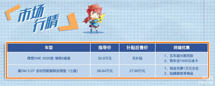 照例我们先来说说两款车的市场行情,理想ONE目前仅有一款车型在售(分为6座和7座版),指导价均为32.8万元,受新能源车补贴政策变化的影响,目前理想ONE暂无政府补贴。目前巡山兄所在城市理想智造官方仅提供五年长期贷款和购车送1000元油卡的活动。