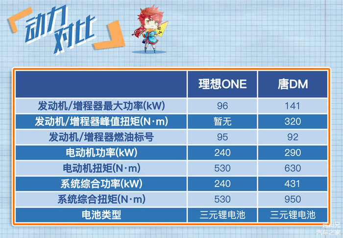 动力方面,比亚迪唐DM相比理想ONE有着压倒性的优势,比亚迪唐DM系统综合功率为431KW,系统综合扭矩950牛·米,而理想ONE系统综合功率为240KW,系统综合扭矩530牛·米。
