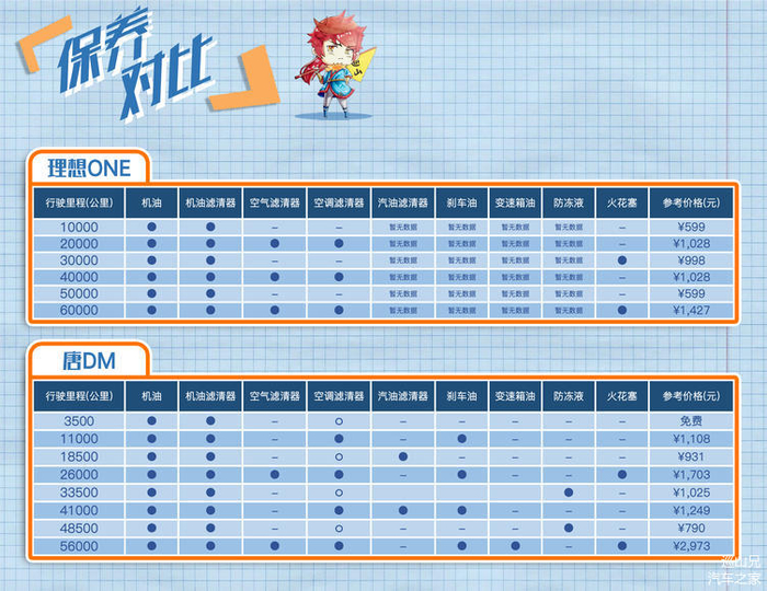 关于保养费用,理想ONE为一万公里一保,更换机油机滤小保养价格为599元。由于理想ONE为新上市车型,因此其汽油滤清器、刹车油、防冻液的价格还未查到。理论上其6万公里的最终价格会比表格中更高一些。
